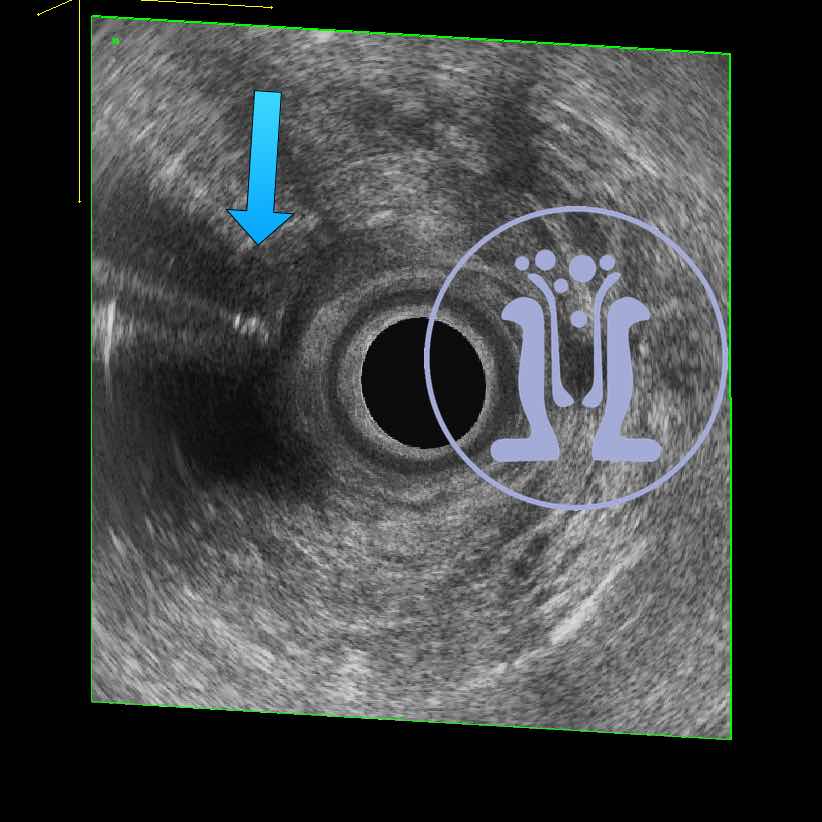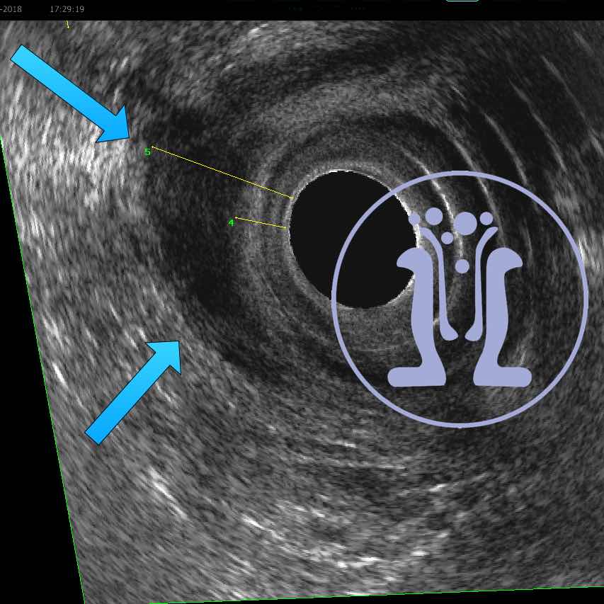 54 ετών κύριος αναφέρει εκροή πύου και φλεγμονής στη περίπρωκτικη περιοχη από 5 μήνες. Κλινικά ανευρέθηκε δερματικό στόμιο στην 3η ώρα. Στη δακτυλική εξέταση ανευρέθηκε ευμέγεθες στόμιο στην 6 ώρα. Με τη σκιαγράφηση του συριγγίου, το ενδοπρωκτικό υπερηχογράφημα επιβεβαιωσε την θέση του πρωκτικού στομίου και ταυτόχρονα έδειξε υψηλό συρίγγιο στην 6η ώρα με επέκταση έως 5 cm από το δακτύλιο του πρωκτού πίσω από την λήκυθο του ορθού.