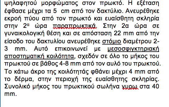 73 ετών κυρία αναφέρει φλεγμονή στο περίνεο που εμφανίσθηκε μετά από πτώση. Κλινικά ανευρέθηκε δερματικό στόμιο στην 3η ώρα. Το ενδοπρωκτικό … Περισσότερα
